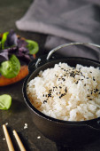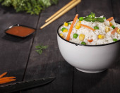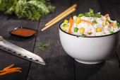 Biały gotowany ryż i ostra koreańska sałatka marchewkowa na talerzu