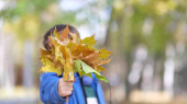 Młoda kobieta z jesiennych liści w dłoni i jesień żółty klon ogród tło