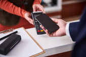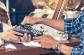 Zdjęcie "Blisko azjatyckiego klienta kobieta dokonać płatności kartą kredytową kontakt po jedzeniu w nowej restauracji normalnej odległości społecznej, aby zmniejszyć dotykanie. Koncepcja bezdotykowa i technologiczna online." może być wykorzystywane do celów osobistych i komercyjnych zgodnie z warunkami zakupionej licencji Royalty-free. Obraz jest dostępny do pobrania w jakości wysokiej rozdzielczości do 5760x3840.