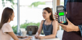 Blisko azjatyckiego klienta kobieta dokonać płatności kartą kredytową kontakt po jedzeniu w nowej restauracji normalnej odległości społecznej, aby zmniejszyć dotykanie. Koncepcja bezdotykowa i technologiczna online.