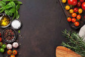 Składniki kuchni włoskiej. Pomidory ogrodowe, makaron, zioła i przyprawy. Widok z góry z miejsca kopiowania. Układy płaskie