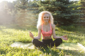 Uśmiechnięta kobieta siedzi na ziemi i pozuje na świeżym powietrzu.