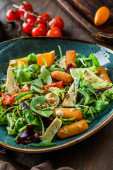 Sałatka jesienna z pieczoną dynią i serem brie. Zdrowa wegańska koncepcja żywności. Czarne tło. Widok z góry.