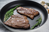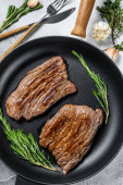 Pieczone żelazo i steki z flanki. Marmurowe mięso wołowe. Szare tło. Widok z góry.