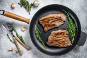 Zdjęcie "Pieczone żelazo i steki z flanki. Marmurowe mięso wołowe. Szare tło. Widok z góry." może być wykorzystywane do celów osobistych i komercyjnych zgodnie z warunkami zakupionej licencji Royalty-free. Obraz jest dostępny do pobrania w jakości wysokiej rozdzielczości do 5760x3840.