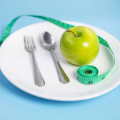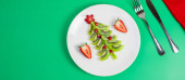 Choinka owocowa; nasiona kiwi i granatu z widelcem i nożem na niebieskim tle. Wesołych Świąt i szczęśliwego Nowego Roku, New You, Zdrowe jedzenie i wegetariańskie
