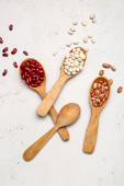 Zestaw różnych suchych roślin strączkowych w drewnianych łyżeczkach, niezbędne białko dla zdrowego stylu życia. Różne rodzaje fasoli. Kamienny beton tło gotowania, widok z góry