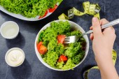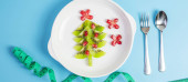 Choinka z ekologicznych warzyw na białym talerzu; Brokuły i pomidory z widelcem i nożem na zielonym tle. Wesołych Świąt i szczęśliwego Nowego Roku, New You, Zdrowe jedzenie i koncepcja wegetariańska