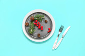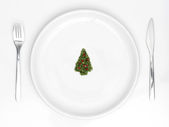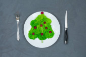 Choinka warzywna i owocowa; nasiona kiwi, truskawek i granatu z widelcem i nożem na zielonym tle. Wesołych Świąt i szczęśliwego Nowego Roku, New You, Zdrowe jedzenie i wegetariańskie