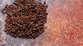 Palone i aromatyczne ziarna kawy na fioletowej powierzchni w tle. Widok z góry i skopiować miejsce na tekst. Makro zdjęcie świeżych arabskich ziaren kawy.