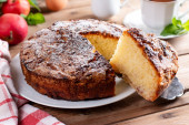 Domowej roboty biszkopt na białym talerzu na drewnianym stole. Nowy Rok i Boże Narodzenie biszkopt na białym talerzu tak miękkie i pyszne ze składnikami: jaja, mąka, mleko na drewnianym stole.