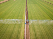 Widok z lotu ptaka ciągnika rozpylającego chemikalia na duże zielone pole