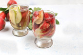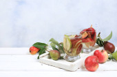 Cydr jabłkowy, sok lub napój owocowy i składniki na słonecznym stole. Koncepcja diety i odchudzania. Jabłka pomagają oczyścić organizm i zmniejszyć wagę. Zdrowe odżywianie,