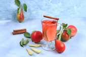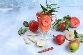 Zdjęcie "Cydr jabłkowy, sok lub napój owocowy i składniki na słonecznym stole. Koncepcja diety i odchudzania. Jabłka pomagają oczyścić organizm i zmniejszyć wagę. Zdrowe odżywianie," może być wykorzystywane do celów osobistych i komercyjnych zgodnie z warunkami zakupionej licencji Royalty-free. Obraz jest dostępny do pobrania w jakości wysokiej rozdzielczości do 5760x3840.