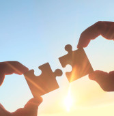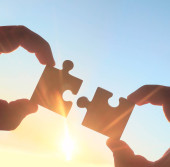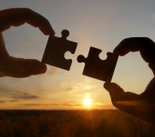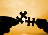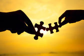 dwie ręce próbuje połączyć kawałki układanki w tle zachodu słońca