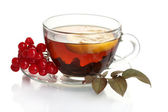 Filiżanka herbaty z dziką różą i zielonymi liśćmi na białym tle