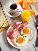 klasyczne śniadanie z jajkiem sadzonym, kiełbasy, boczek i kawy