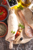 Zdjęcie "surowe ciasto pizza ze składnikiem na pokładzie" może być wykorzystywane do celów osobistych i komercyjnych zgodnie z warunkami zakupionej licencji Royalty-free. Obraz jest dostępny do pobrania w jakości wysokiej rozdzielczości do 5760x3840.