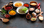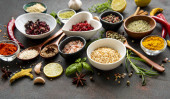 Zdjęcie "Różne przyprawy w misach na czarnym betonowym tle. Góra widok miejsca kopiowania." może być wykorzystywane do celów osobistych i komercyjnych zgodnie z warunkami zakupionej licencji Royalty-free. Obraz jest dostępny do pobrania w jakości wysokiej rozdzielczości do 5760x3840.