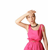 zaskoczony blondynka w różowej sukience z bańki myśli