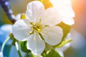 Biały kwiat kwitnący w słońcu. Makrofotografia. Zbliżenie. Wiosną. Nowy początek.