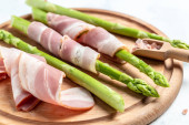 Zielone szparagi owinięte bekonem na drewnianym stole.