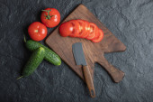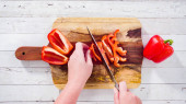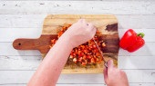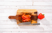 Leżeć płasko. Mielenie organicznej czerwonej papryki na desce do krojenia drewna.