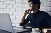 Wesoły etniczny mężczyzna w luźnym stroju siedzi przy drewnianym stole z laptopem i uśmiecha się rozmawiając na smartfonie i odwracając wzrok