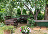 Kolorowy, urządzony stół w lecie. Impreza ogrodowa. Obiad. Letni taras ogrodowy.. Wysokiej jakości zdjęcie