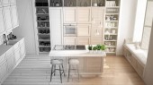 Zdjęcie "Kuchnia wiejska, ekologiczny wystrój wnętrz w odcieniach beżu, zrównoważony parkiet, rośliny doniczkowe, zioła, drewniane półki, kuchenka mikrofalowa i lodówka. Koncepcja naturalnej architektury nadającej się do recyklingu" może być wykorzystywane do celów osobistych i komercyjnych zgodnie z warunkami zakupionej licencji Royalty-free. Obraz jest dostępny do pobrania w jakości wysokiej rozdzielczości do 5760x3840.