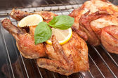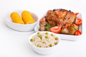 cały złoty Kurczak pieczony z pieczonymi ziemniakami, świeży pomidor
