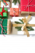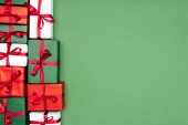 górny widok kolorowych pudełek i cukierków na zielonym tle z miejsca kopiowania