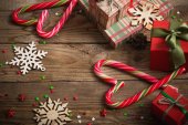 górny widok pudełek z prezentami, kulki świąteczne, laski cukierki i dekoracyjne płatki śniegu na zielonym tle