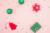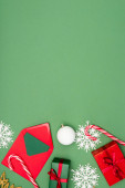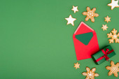widok z góry czerwonej koperty z karty w pobliżu bombki Bożego Narodzenia, pieczone gwiazdy i laski cukierki na zielony
