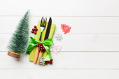 Zdjęcie "Widok z góry świąteczne dekoracje na drewnianym tle. Widelec i nóż na serwetce związane wstążką i puste miejsce do projektowania. Koncepcja nowego roku." może być wykorzystywane do celów osobistych i komercyjnych zgodnie z warunkami zakupionej licencji Royalty-free. Obraz jest dostępny do pobrania w jakości wysokiej rozdzielczości do 5760x3840.