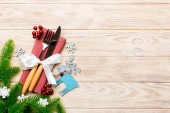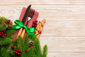 Widok z góry świąteczne dekoracje na drewnianym tle. Widelec i nóż na serwetce związane wstążką i puste miejsce do projektowania. Koncepcja nowego roku.