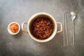 Koreański czarny spaghetti lub instant makaron z pieczonym sosem sojowym chajung (chapagetti) - koreański styl żywności
