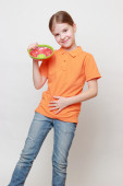 piękna, młoda dziewczyna pozuje do zdjęcia na biały