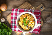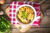 Champignons w sosie śmietankowym przy białym stole.