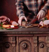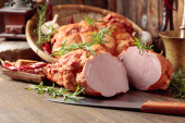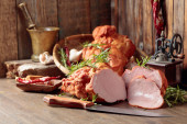 Wędzona szynka z ziołami, przyprawami i przyborami kuchennymi na starym drewnianym stole.