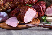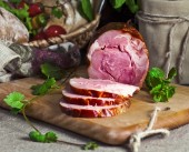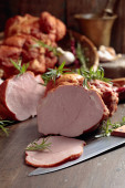 Wędzona szynka z ziołami, przyprawami i przyborami kuchennymi na starym drewnianym stole. Skupienie selektywne.