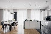 Eleganckie, czarno-białe wnętrze apartamentu z kuchnią i jadalnią otwartą na salon