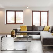 Prosty i elegancki salon z beżową kanapą, czarnym stołem kawowym, drewnianą podłogą i długimi, czarnymi żaluzjami w dużych oknach