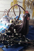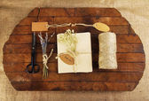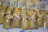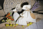 włókienniczych saszetka etui z suszonych kwiatów, ziół i jagód na drewnianym stole, na tle worze