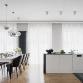 Stylowa czarno-biała jadalnia z nowoczesnym stołem i czterema krzesłami pod dwoma czarnymi lampami wiszącymi