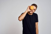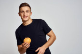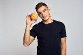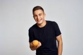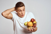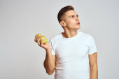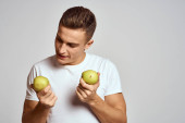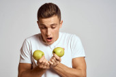 Facet z jabłkami w dłoniach na jasnym tle w białej koszulce gestykulował dłońmi uśmiechem