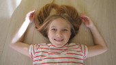 Mała uśmiechnięta dziewczyna z blond włosami spoglądająca w kamerę. Zbliż emocje pięknego dziecka z dobrą miną. Portret szczęśliwej kobiety na tle ściany.