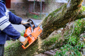 Złamał drzewo pnia po huraganie człowieka, który ścina drzewo piłą łańcuchową.