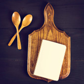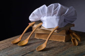 Kapelusz szefa kuchni z książkami kucharskimi i drewnianą łyżką na czarnym tle