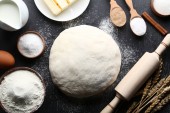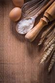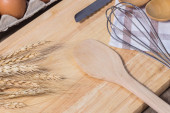 Czapka szefa kuchni z wałkiem, łyżka z mąką i naczynia do gotowania na brązowym tle